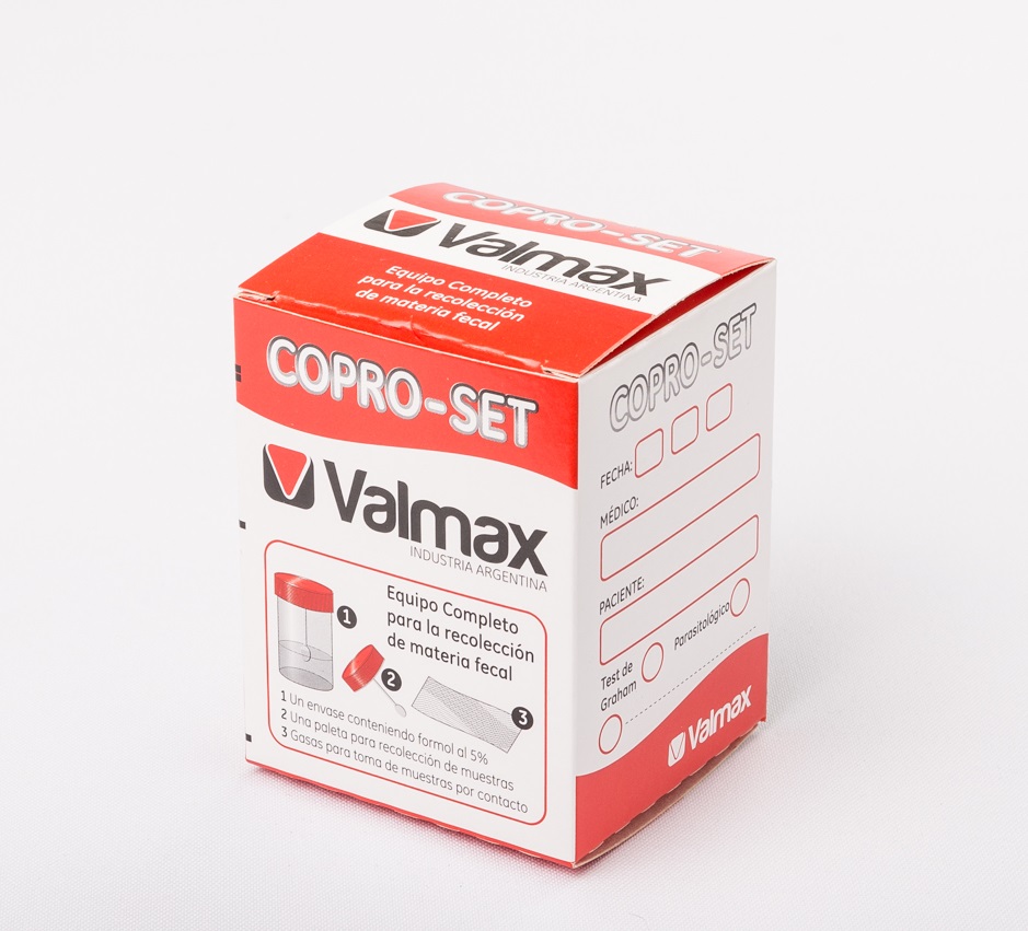 Envase de 60 cc de capacidad, con tapa a rosca hermética de 1/3 de vuelta y paleta recolectora incorporada en la misma, conteniendo aproximadamente 25 ml de formol al 5% para recolección de muestras con destino a análisis coproparasitológico.