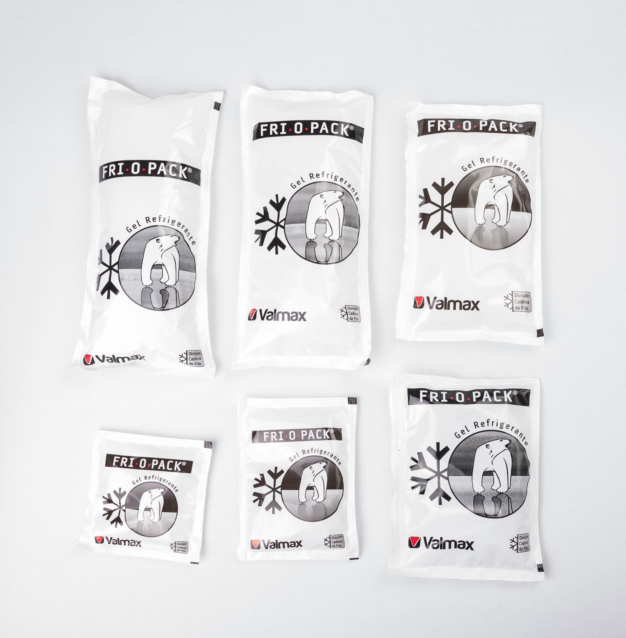 Sachets de polietileno de 170 micrones de espesor o en trilaminado (OOP – PEDB), con soldaduras lineales de alta presión, que confieren al envase alta resistencia a las roturas. En función a las cantidades hay posibilidad de incluir su logotipo en la impresión. todos los refrigerantes FRI•O•PACK mejoran notablemente el rendimiento de su acondicionamiento para la logística de cadena de frío, evitando además el complicado uso del hielo seco, como el inconveniente de la acumulación de agua en el contenedor al usar hielo común. Todos los refrigerantes se presentan acondicionados en cajas de cartón corrugado especialmente diseñadas