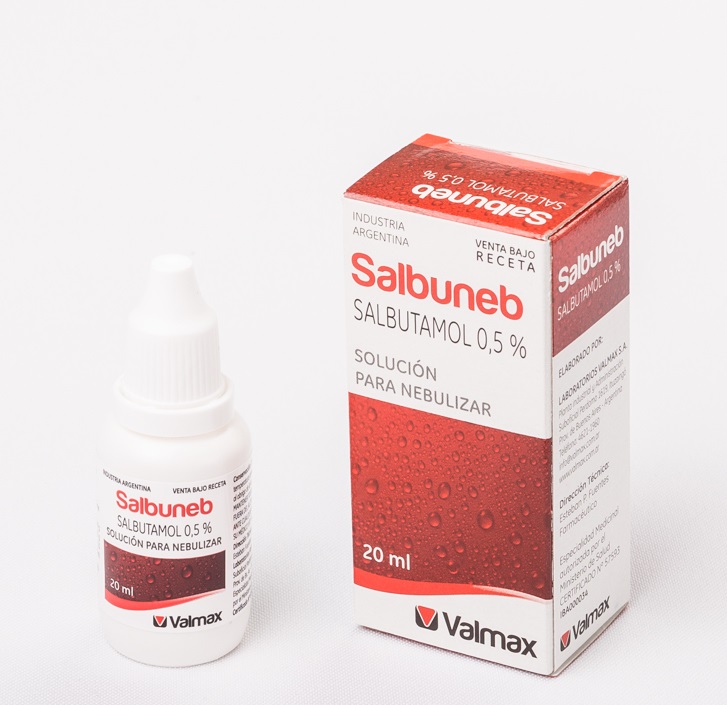 Salbutamol  – solución para Nebulizar- Broncodilatador, indicado  para el alivio de broncoespasmos.  Venta bajo receta. Presentaciones de 20ml y hospitalario de 20ml x 40u. y 10ml x 40u.